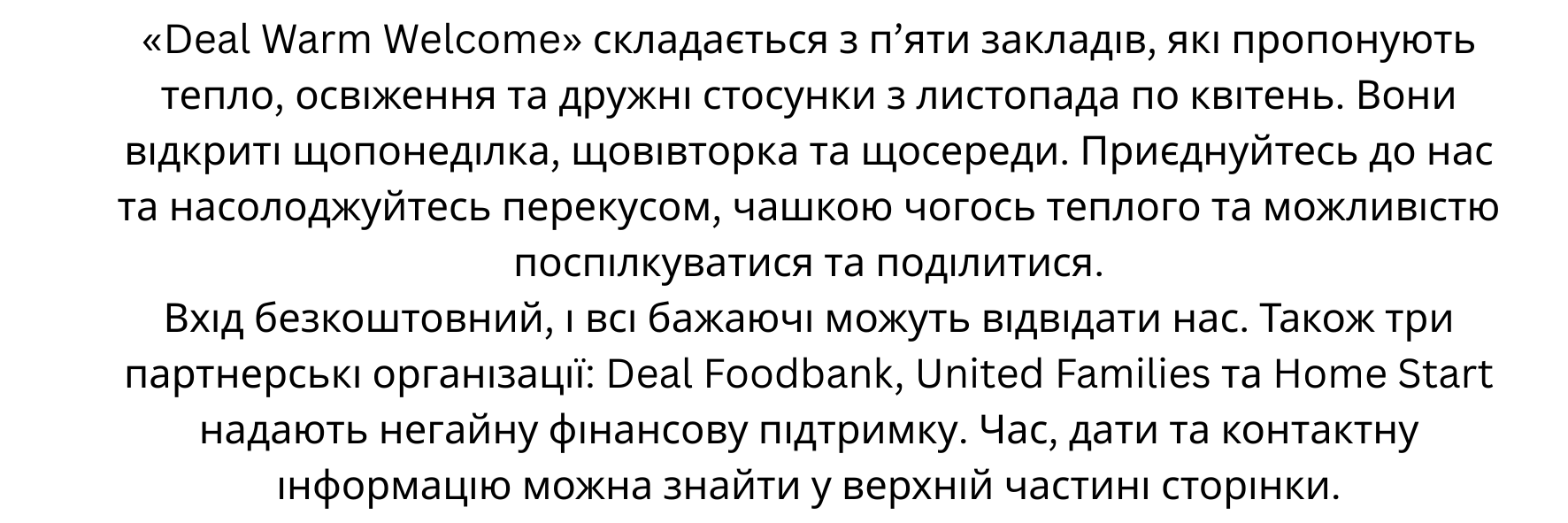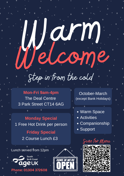 At the Deal Centre in Park Street the Age UK team are running a Warm Space on Monday to Friday 9am to 4pm from October to March.